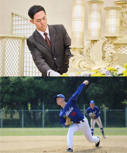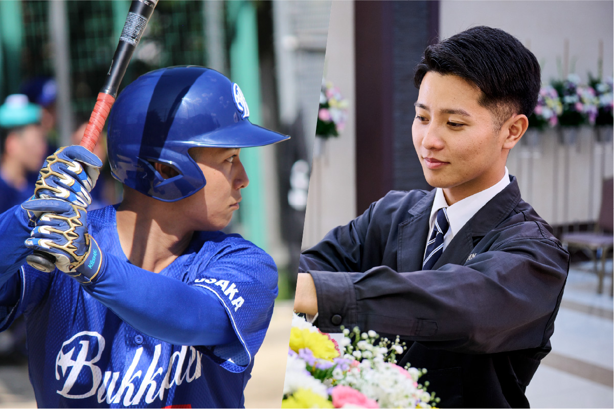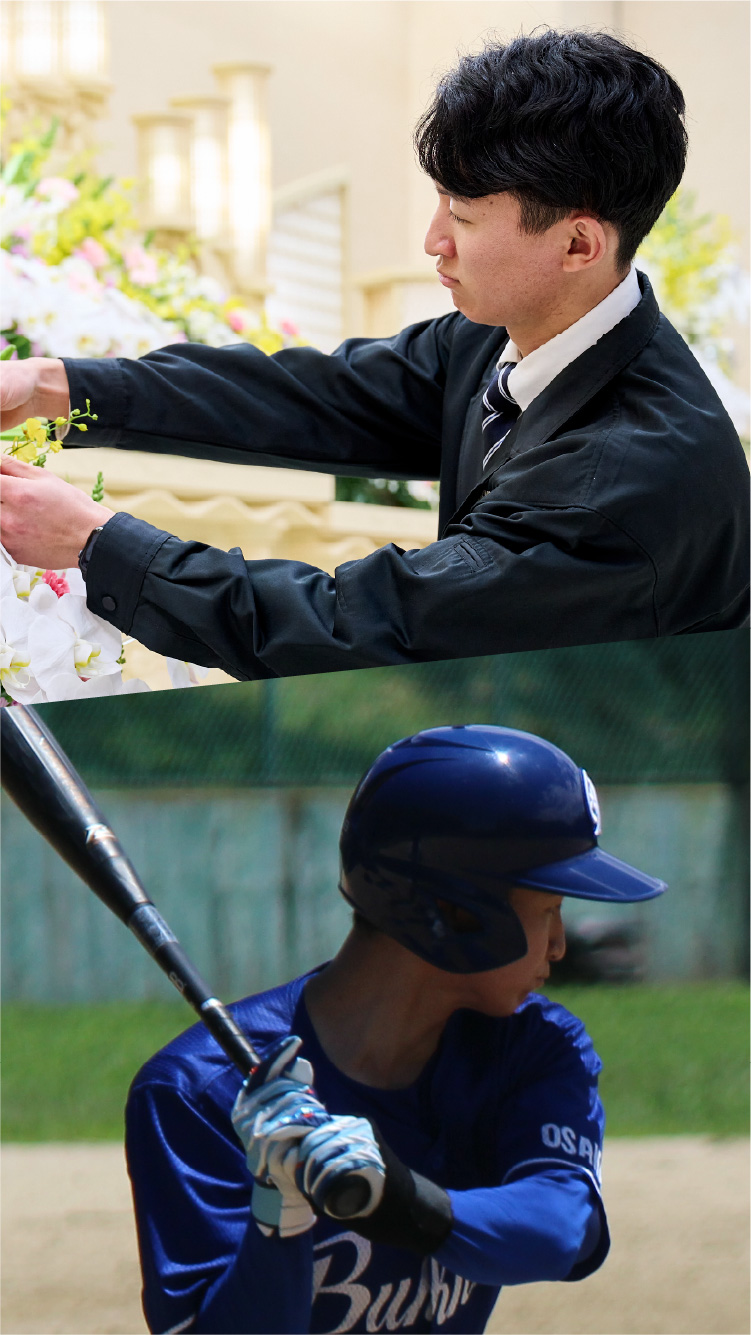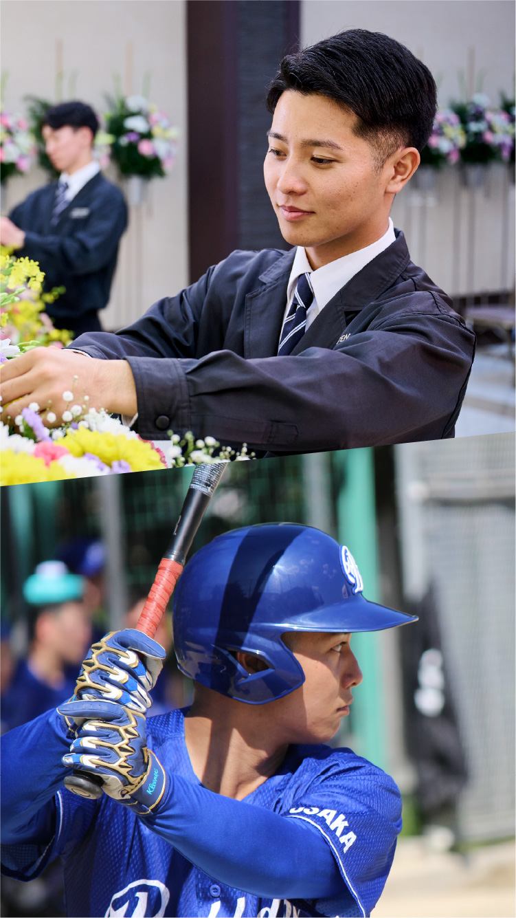 高校時代から投手として思うように投げられなくなり、大学でも試合に出られない日々が続き、裏方として人を支える道が自分には合っていると思っていました。しかし、入社後は考えが変わりました。知識も経験もゼロの状態で始まった仕事は、不安と失敗の連続でした。それでも先輩方の熱い指導を受けながら課題を乗り越え、自分でも気づかなかった強みを引き出していただきました。その結果、接客部門への配属のチャンスを得て、挑戦を重ねるごとに自信を深め、今では式典ディレクターとしてご遺族の最も大切な瞬間を支える立場を任されています。安心されるご遺族の様子を見るたび「挑戦してよかった」と心から実感しています。